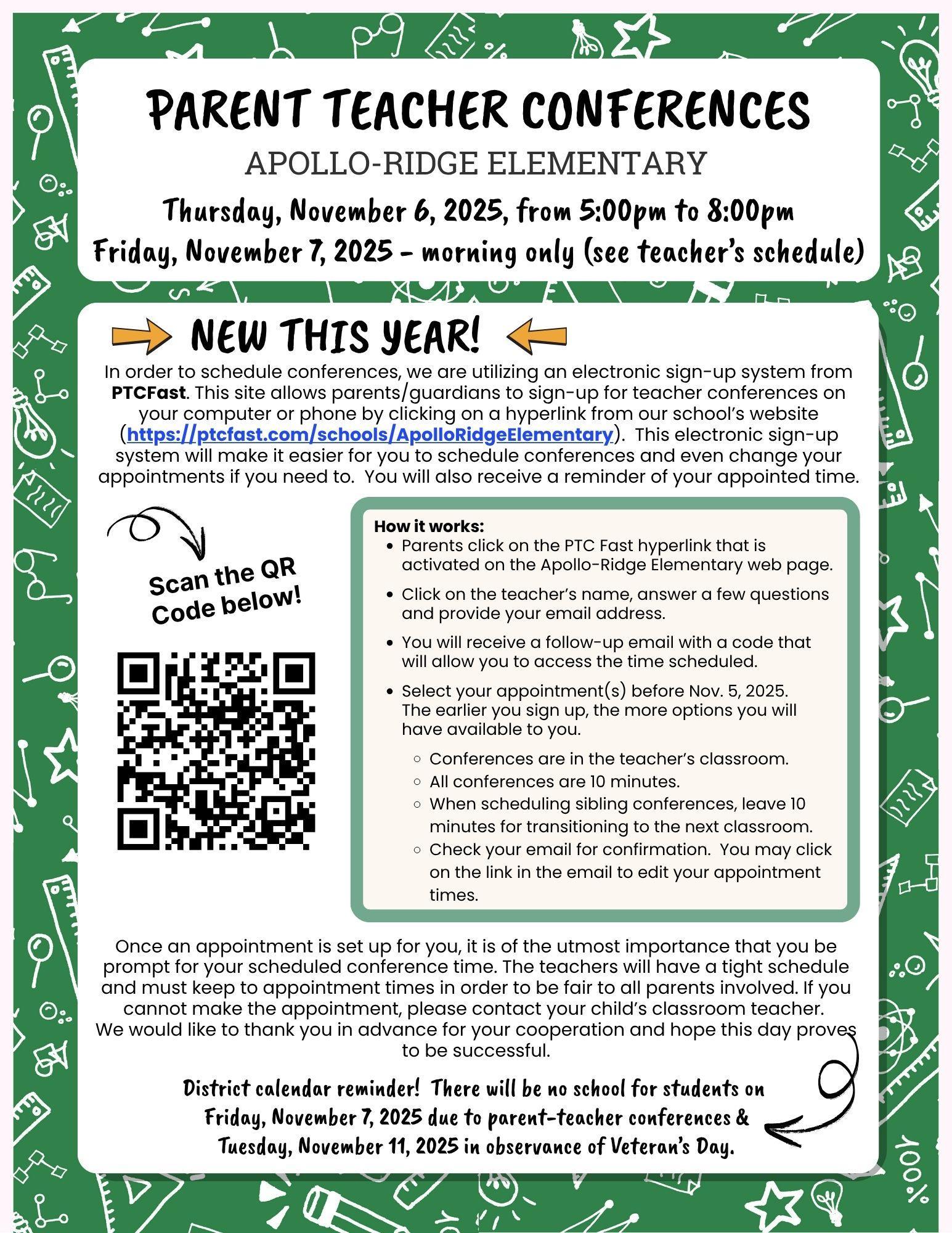(PTC Fast Apollo-Ridge Elementary). This electronic sign-up system will make it easier for you to schedule conferences and even change your appointments if you need to. You will also receive a reminder of your appointed time.